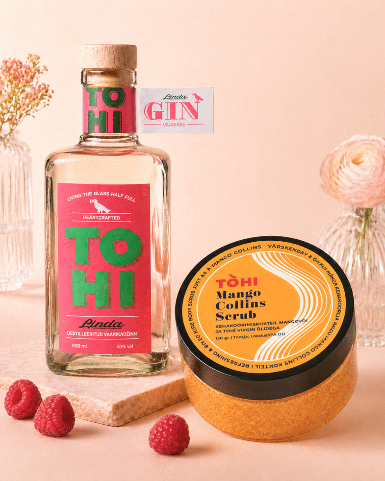 Omamoodi komplekt, millest leiad kaks veidi ootamatut, aga väga hästi kokkukõlavat toodet: Tohi Linda vaarikadžinni ja Mango Collins Scrub kehakoorija. Üks on mõeldud kokteiliklaasi, teine kehale. Mõlemal on Tohi Distilleryle omane mänguline iseloom, kvaliteetne teostus ja lõhn, mis paneb korraks peatuma.
