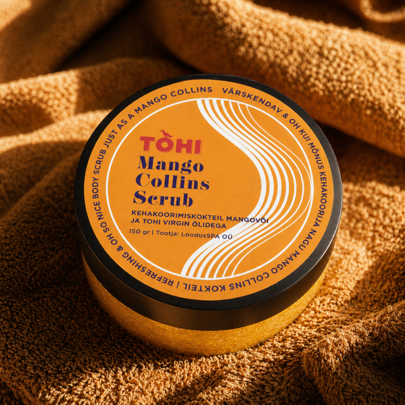 Tohi Mango Collins Scrub on kehakoorija, mis on saanud inspiratsiooni kuulsast Collins kokteilist. Alkoholi see ei sisalda, kuid lõhnab jumalikult – nagu väike troopiline hetk vannitoas. Mangovõi, suhkrukristallid ja hooldavad taimeõlid aitavad nahka koorida, pehmendada ja siidiseks jätta. Erilise TOHI puudutuse annavad koorijale õlid, mis jäävad üle alkoholivaba džinni valmistamisest.
